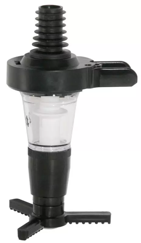 Spirituosen-Dosierer, aus schwarzem Kunststoff, Pfropfen in drei Größen auswechselbar (siehe Art. 349), Lieferung mit Standardpfropfen für 0,75 l bzw. 1 l-Flaschen, nicht geeignet für Anisschnaps, nicht zerlegbar